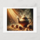A teapot surrounded by steaming cups sits on a wooden table. Warm light streams in, casting shadows and creating an inviting, cozy atmosphere.