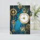 Turquoise, textured, steampunk background with brass and gold gears, a silver key and the clock. Steampunk style.