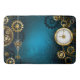Turquoise, textured, steampunk background with brass and gold gears, a silver key and the clock. Steampunk style.