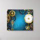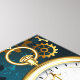Turquoise, textured, steampunk background with brass and gold gears, a silver key and the clock. Steampunk style.