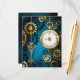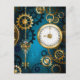 Turquoise, textured, steampunk background with brass and gold gears, a silver key and the clock. Steampunk style.