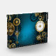 Turquoise, textured, steampunk background with brass and gold gears, a silver key and the clock. Steampunk style.