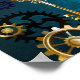 Turquoise, textured, steampunk background with brass and gold gears, a silver key and the clock. Steampunk style.