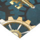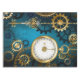 Turquoise, textured, steampunk background with brass and gold gears, a silver key and the clock. Steampunk style.