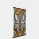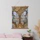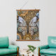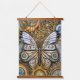 This is a steampunk hanging tapestry featuring a butterfly with vintage clocks and the inside gears of clocks in shades of light blue and brown.