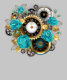 Patterned, antique watch, adorned with jewellery, gold hour hands and Latin numerals with turquoise roses on brown, striped background. Steampunk style.