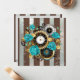 Patterned, antique watch, adorned with jewellery, gold hour hands and Latin numerals with turquoise roses on brown, striped background. Steampunk style.