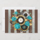 Patterned, antique watch, adorned with jewellery, gold hour hands and Latin numerals with turquoise roses on brown, striped background. Steampunk style.