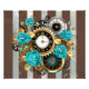 Patterned, antique watch, adorned with jewellery, gold hour hands and Latin numerals with turquoise roses on brown, striped background. Steampunk style.