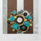 Patterned, antique watch, adorned with jewellery, gold hour hands and Latin numerals with turquoise roses on brown, striped background. Steampunk style.