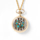 Patterned, antique watch, adorned with jewellery, gold hour hands and Latin numerals with turquoise roses on brown, striped background. Steampunk style.