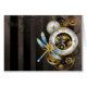 Antique dials with gold and brass gears, decorated with mechanical dragonfly on brown, striped background. Steampunk.