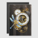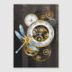 Antique dials with gold and brass gears, decorated with mechanical dragonfly on brown, striped background. Steampunk.