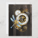 Antique dials with gold and brass gears, decorated with mechanical dragonfly on brown, striped background. Steampunk.