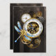 Antique dials with gold and brass gears, decorated with mechanical dragonfly on brown, striped background. Steampunk.