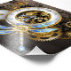 Antique dials with gold and brass gears, decorated with mechanical dragonfly on brown, striped background. Steampunk.