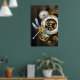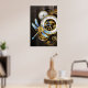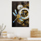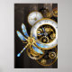 Antique dials with gold and brass gears, decorated with mechanical dragonfly on brown, striped background. Steampunk.