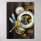 Antique dials with gold and brass gears, decorated with mechanical dragonfly on brown, striped background. Steampunk.