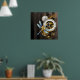 Antique dials with gold and brass gears, decorated with mechanical dragonfly on brown, striped background. Steampunk.