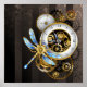 Antique dials with gold and brass gears, decorated with mechanical dragonfly on brown, striped background. Steampunk.