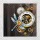 Antique dials with gold and brass gears, decorated with mechanical dragonfly on brown, striped background. Steampunk.