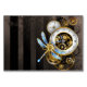 Antique dials with gold and brass gears, decorated with mechanical dragonfly on brown, striped background. Steampunk.