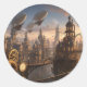 A stunning, panoramic view of a steampunk city where Victorian elegance meets futuristic machinery. The scene features ornate buildings, a network of elevated bridges, and giant, intricate gears that are part of the city's foundation. Steam-powered airships fill the sky, all illuminated by the warm, atmospheric glow of gas lamps.