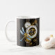 Antique dials with gold and brass gears, decorated with mechanical dragonfly on brown, striped background. Steampunk.