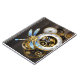 Antique dials with gold and brass gears, decorated with mechanical dragonfly on brown, striped background. Steampunk.