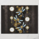 Antique dials and keys with gold and brass gears, decorated with mechanical, steampunk dragonflies on brown, striped background.