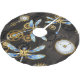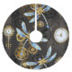 Antique dials and keys with gold and brass gears, decorated with mechanical, steampunk dragonflies on brown, striped background.