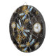 Antique dials and keys with gold and brass gears, decorated with mechanical, steampunk dragonflies on brown, striped background.