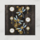 Antique dials and keys with gold and brass gears, decorated with mechanical, steampunk dragonflies on brown, striped background.