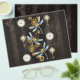 Antique dials and keys with gold and brass gears, decorated with mechanical, steampunk dragonflies on brown, striped background.