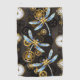Antique dials and keys with gold and brass gears, decorated with mechanical, steampunk dragonflies on brown, striped background.