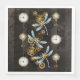 Antique dials and keys with gold and brass gears, decorated with mechanical, steampunk dragonflies on brown, striped background.
