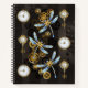 Antique dials and keys with gold and brass gears, decorated with mechanical, steampunk dragonflies on brown, striped background.