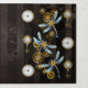 Antique dials and keys with gold and brass gears, decorated with mechanical, steampunk dragonflies on brown, striped background.