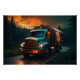 About "Steampunk Fire-Truck" - An artist's impression of an old-fashioned fire-truck in full steampunk-style detailing, featuring brass and copper regalia and iridescent blue cab. A raging wildfire lights up the twilight sky in the distance.