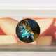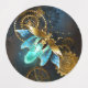 Steampunk firefly with blue transparent wings and green light bulb on worn, brown, textured background. Steampunk style.