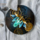 Steampunk firefly with blue transparent wings and green light bulb on worn, brown, textured background. Steampunk style.