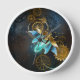 Steampunk firefly with blue transparent wings and green light bulb on worn, brown, textured background. Steampunk style.