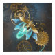 Steampunk firefly with blue transparent wings and green light bulb on worn, brown, textured background. Steampunk style.