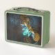 Steampunk firefly with blue transparent wings and green light bulb on worn, brown, textured background. Steampunk style.