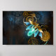Steampunk firefly with blue transparent wings and green light bulb on worn, brown, textured background. Steampunk style.