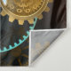 Steampunk firefly with blue transparent wings and green light bulb on worn, brown, textured background. Steampunk style.