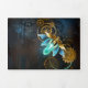 Steampunk firefly with blue transparent wings and green light bulb on worn, brown, textured background. Steampunk style.