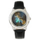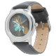 Steampunk firefly with blue transparent wings and green light bulb on worn, brown, textured background. Steampunk style.