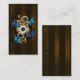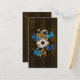 Composition of round steampunk clock with black Roman numeral dial, decorated with gold and brass gears, blue Morpho butterflies and damaged lenses on brown striped background. Steampunk style.