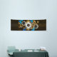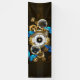 Composition of round steampunk clock with black Roman numeral dial, decorated with gold and brass gears, blue Morpho butterflies and damaged lenses on brown striped background. Steampunk style.